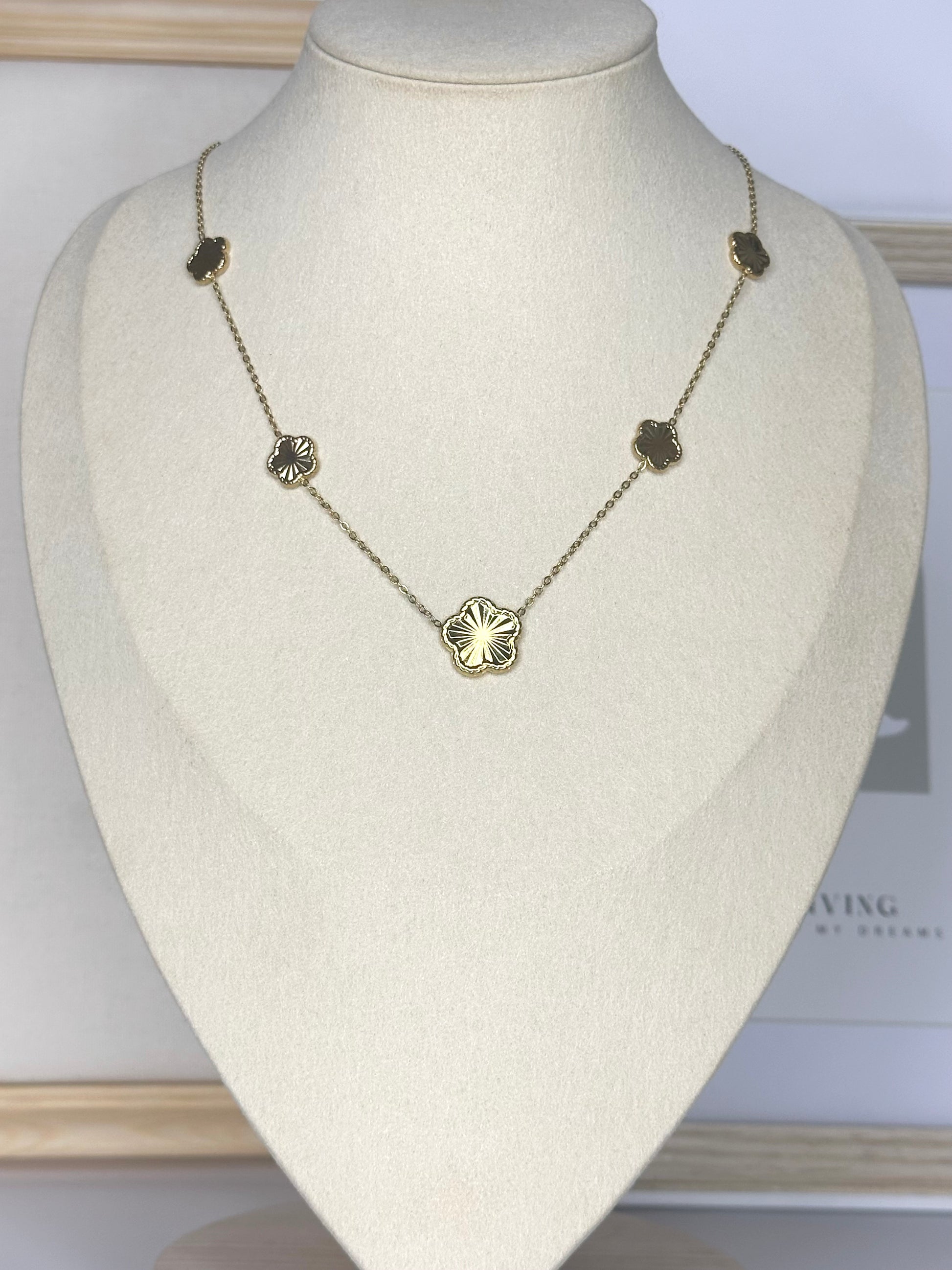 Amira célèbre la beauté florale avec ses médaillons dorés aux contours doux et élégants. Chaque motif évoque une fleur stylisée, capturant la lumière avec justesse et raffinement.