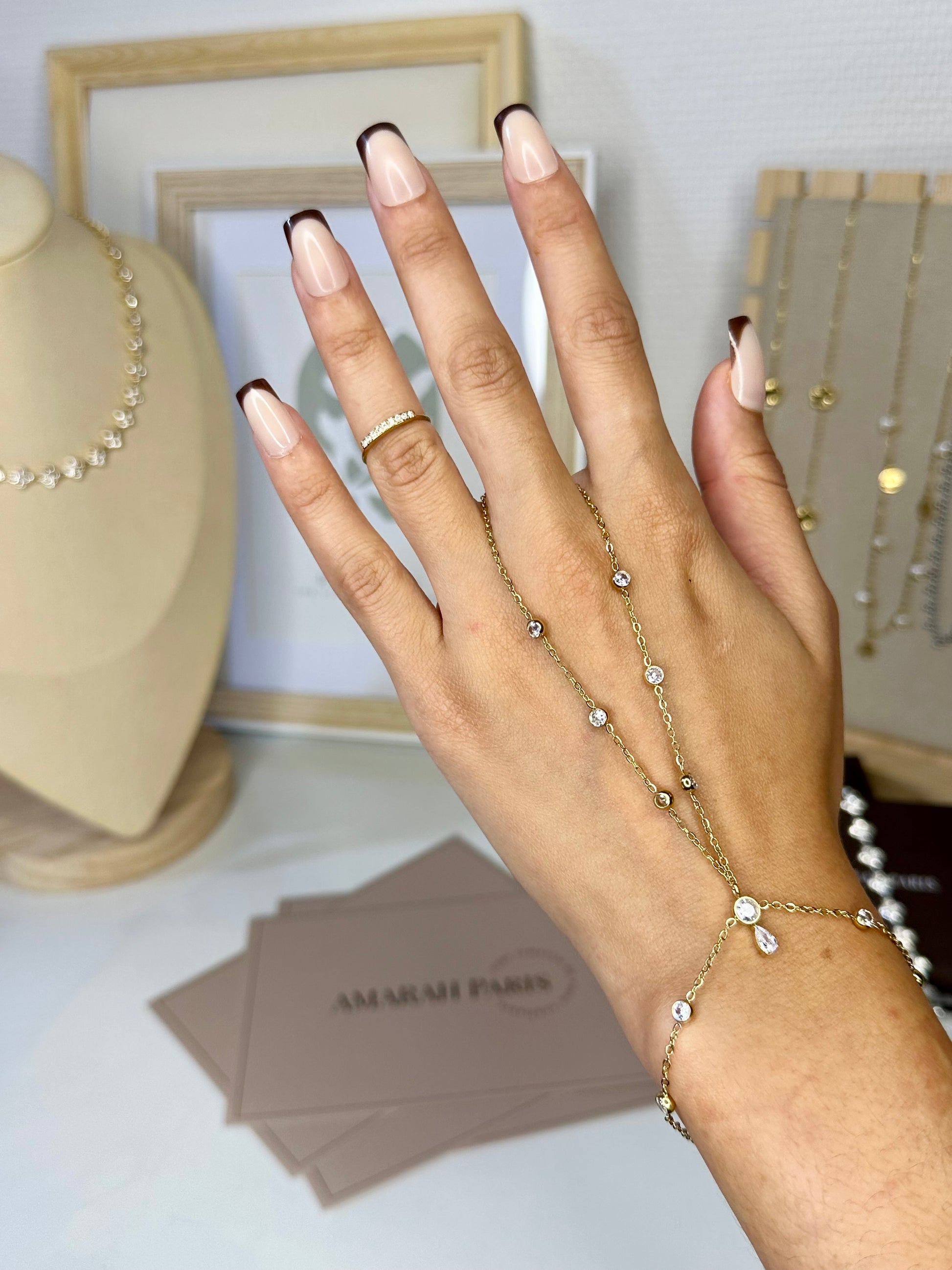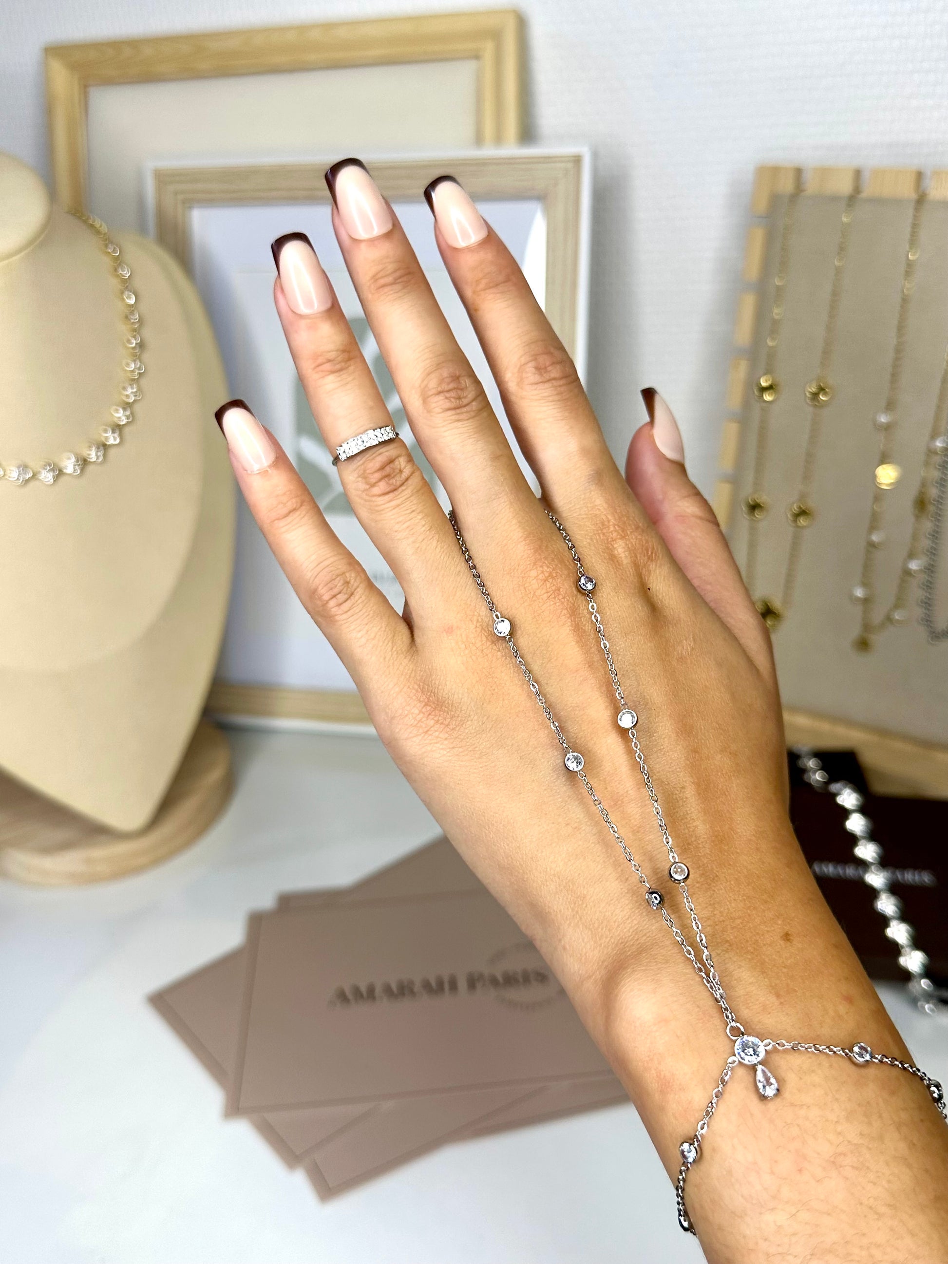 Le bijou de main Aurora illumine vos gestes avec élégance et subtilité. Son design raffiné associe un bracelet et une bague grâce à une fine chaîne sertie de zircons étincelants qui captent la lumière à chaque mouvement.