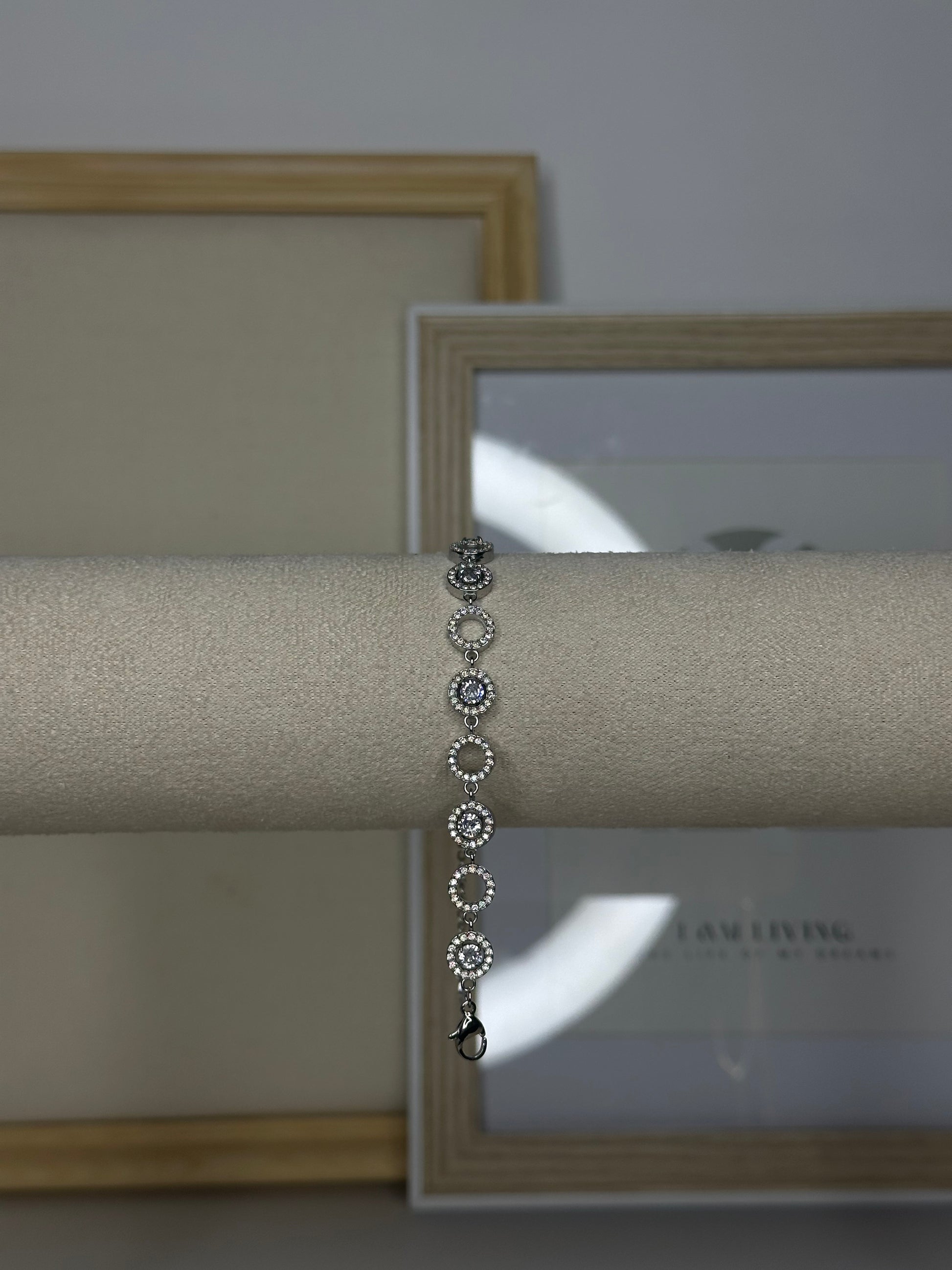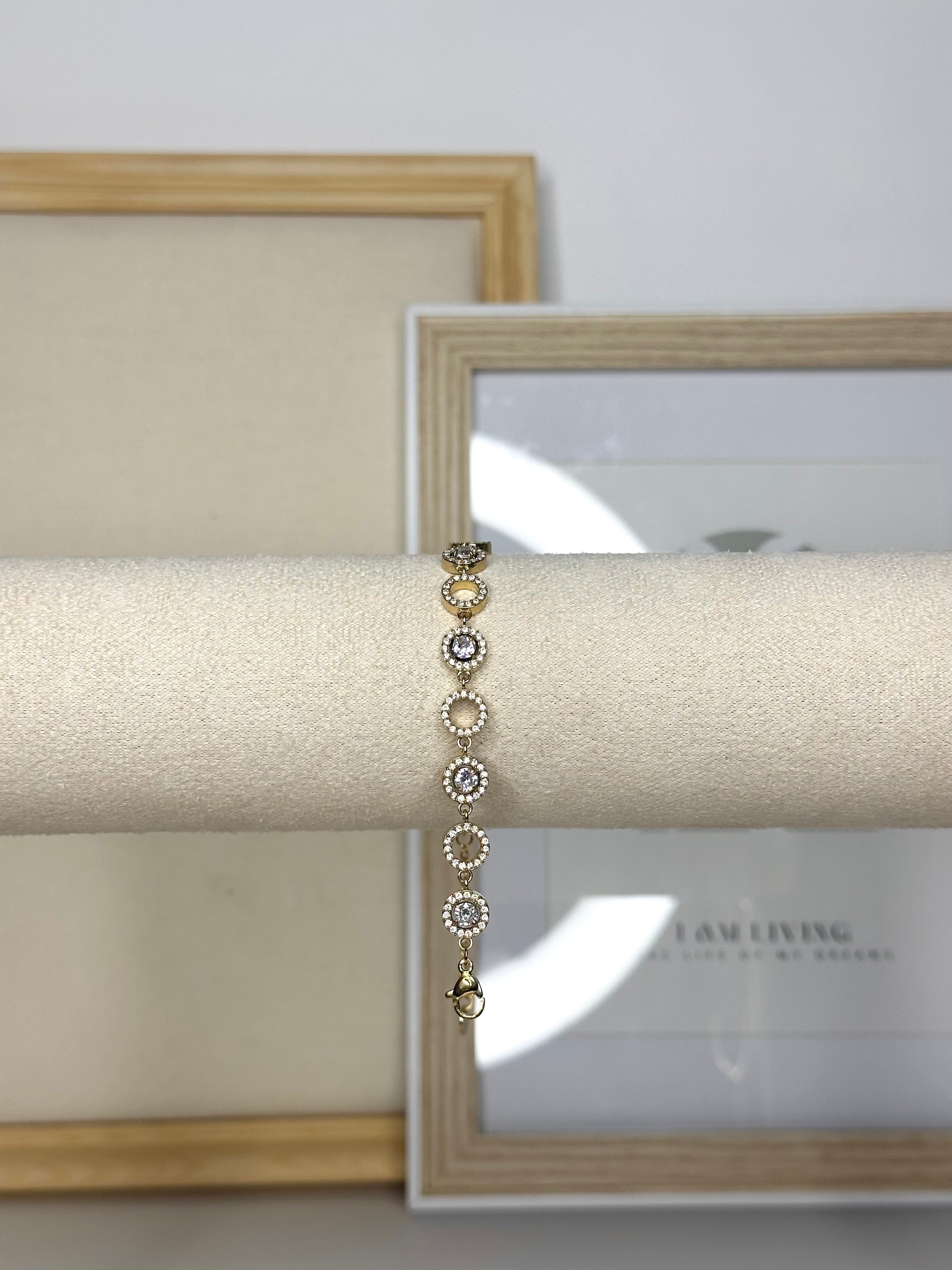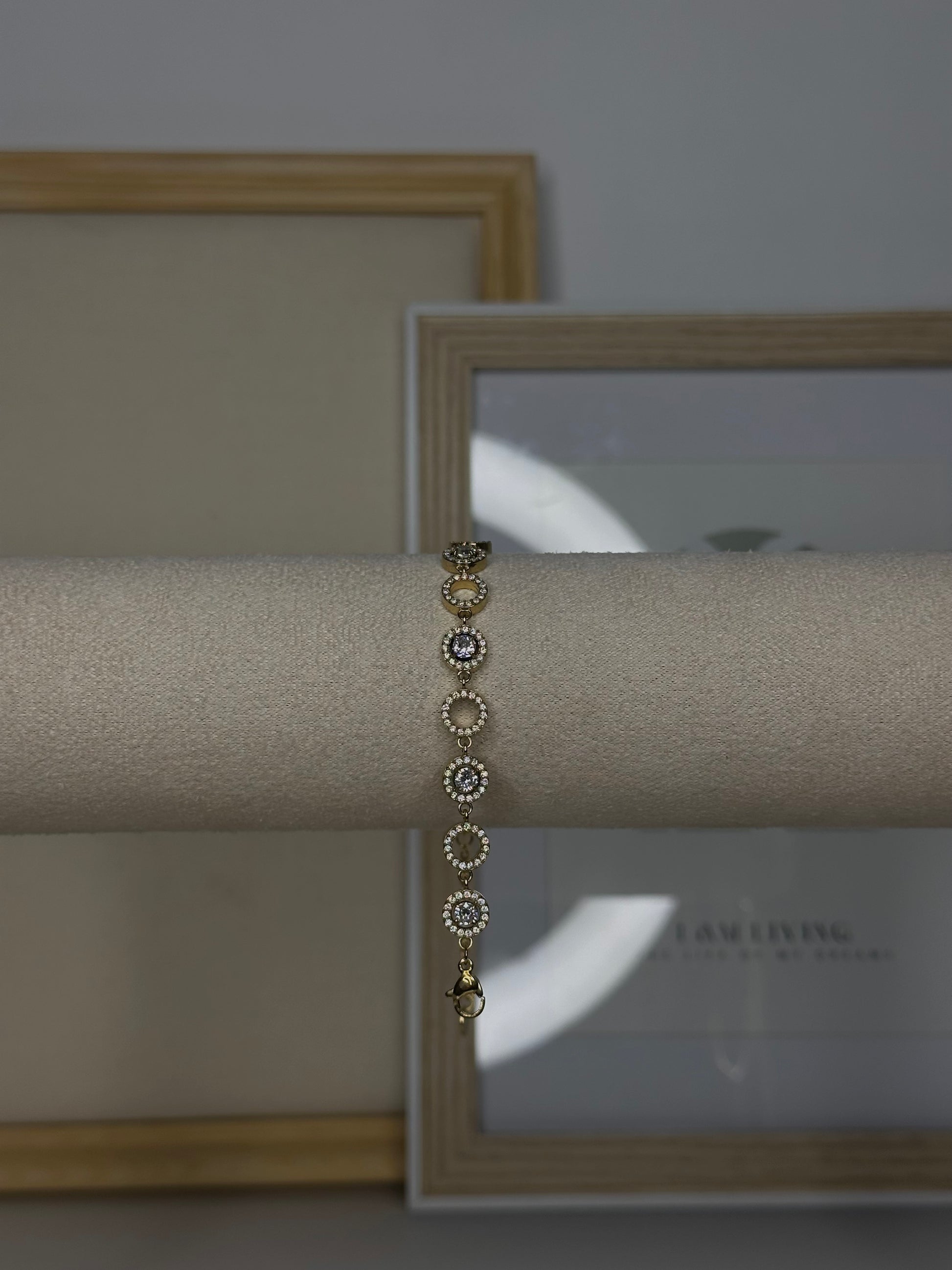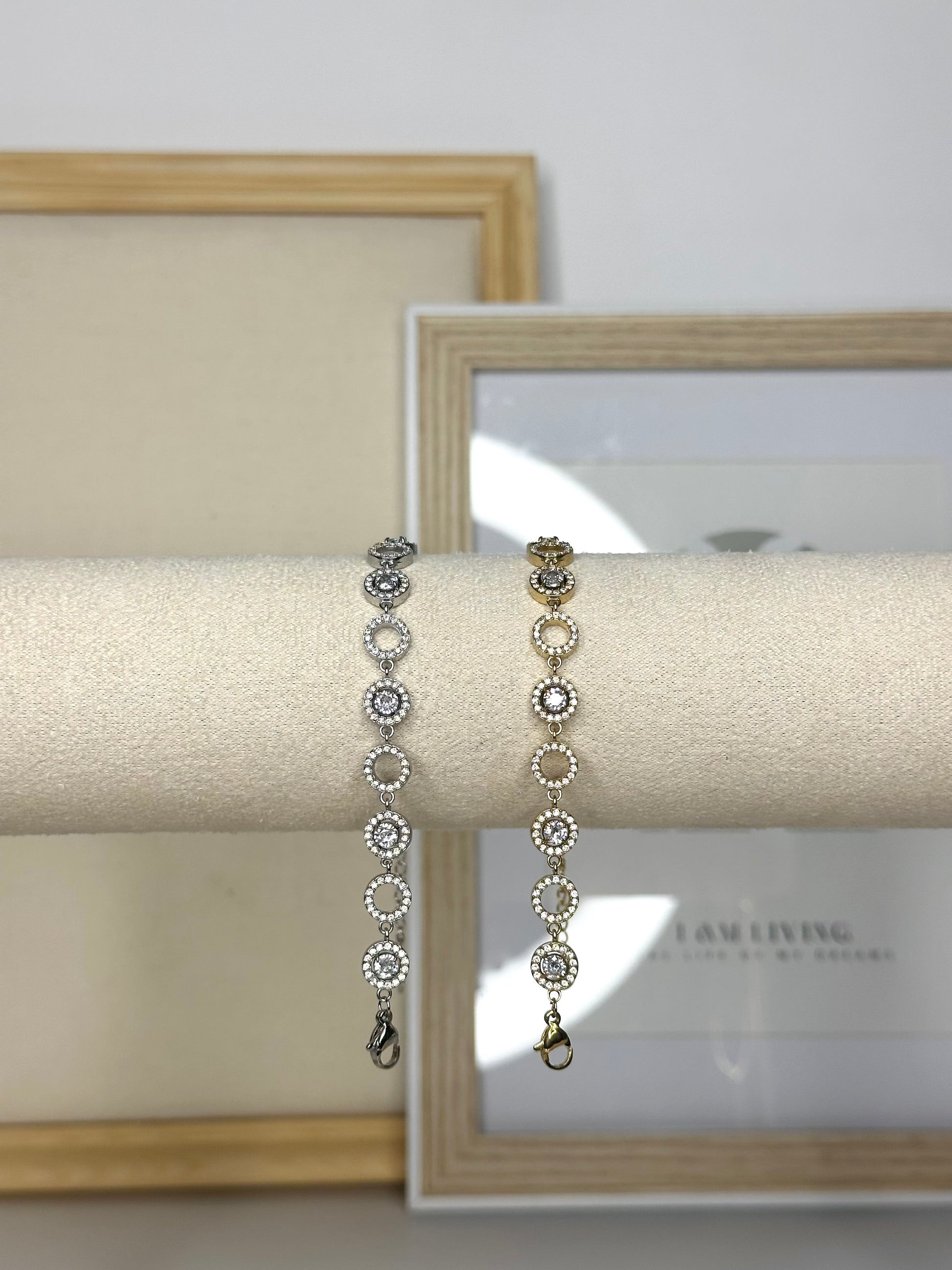 Le bracelet Élizia se distingue par son enchaînement de maillons circulaires délicatement sculptés, chacun sublimé d’un éclat central entouré de fines finitions perlées. Ce jeu d’alternance crée un rendu lumineux, chic et harmonieux, qui habille le poignet avec une sophistication naturelle.