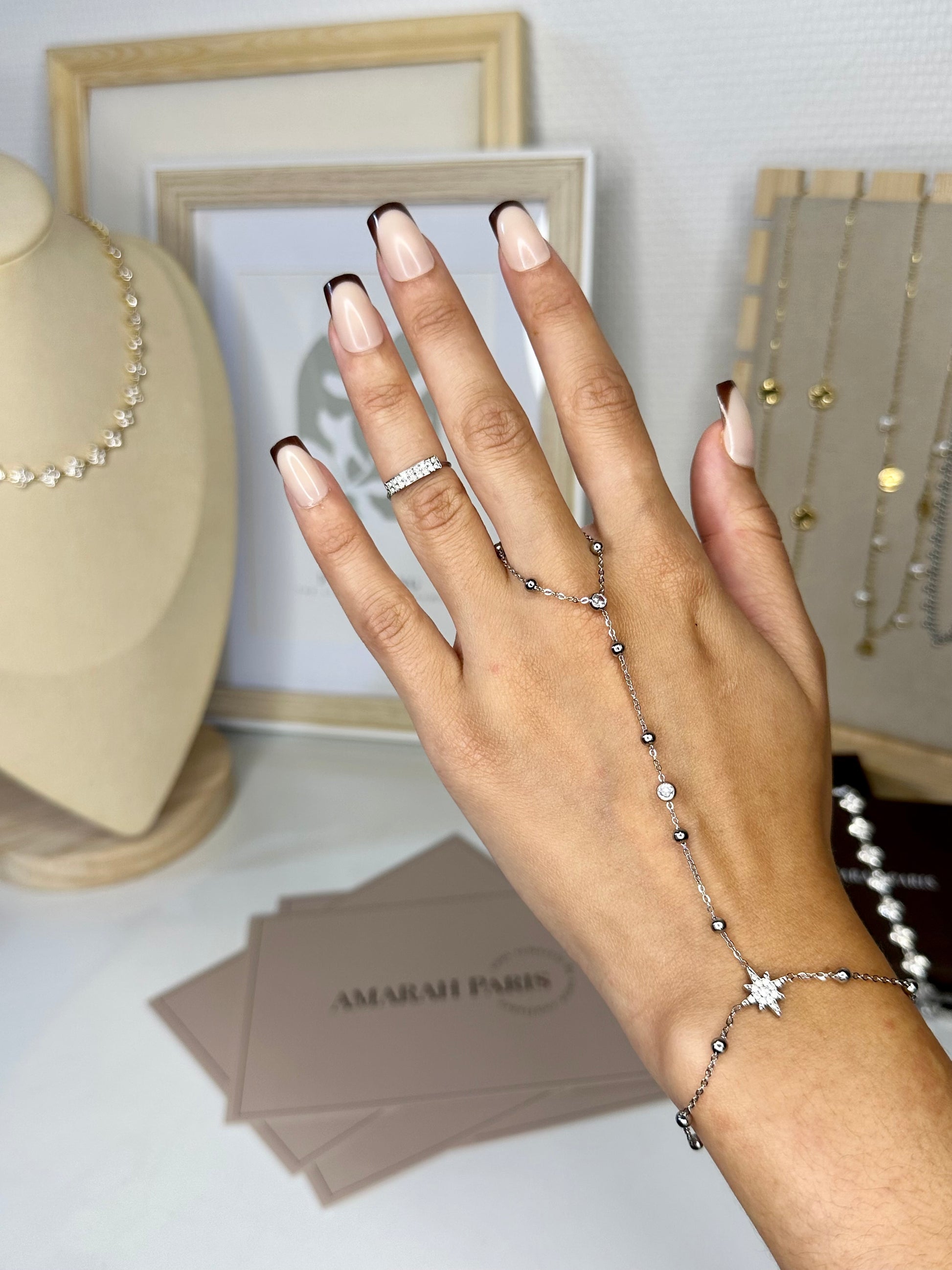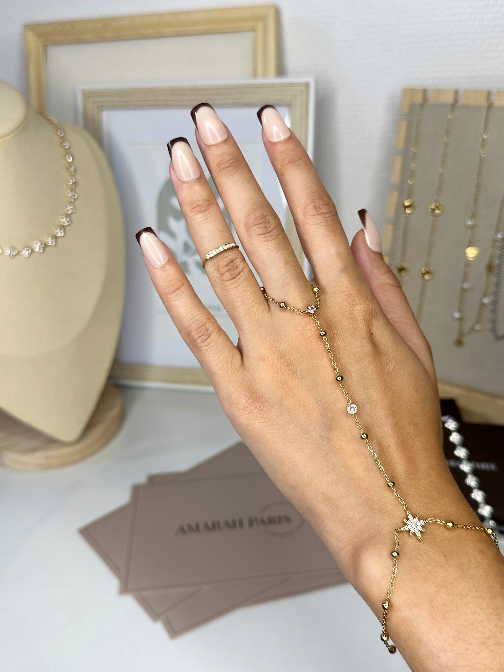 Le bijou de main Estrella sublime vos gestes avec éclat et raffinement. Finement travaillé, il relie délicatement un bracelet à une bague grâce à une chaîne ornée de perles et de zircons scintillants. Sa délicate étoile cristalline, placée au creux du poignet, en fait une pièce lumineuse et féminine qui attire tous les regards.