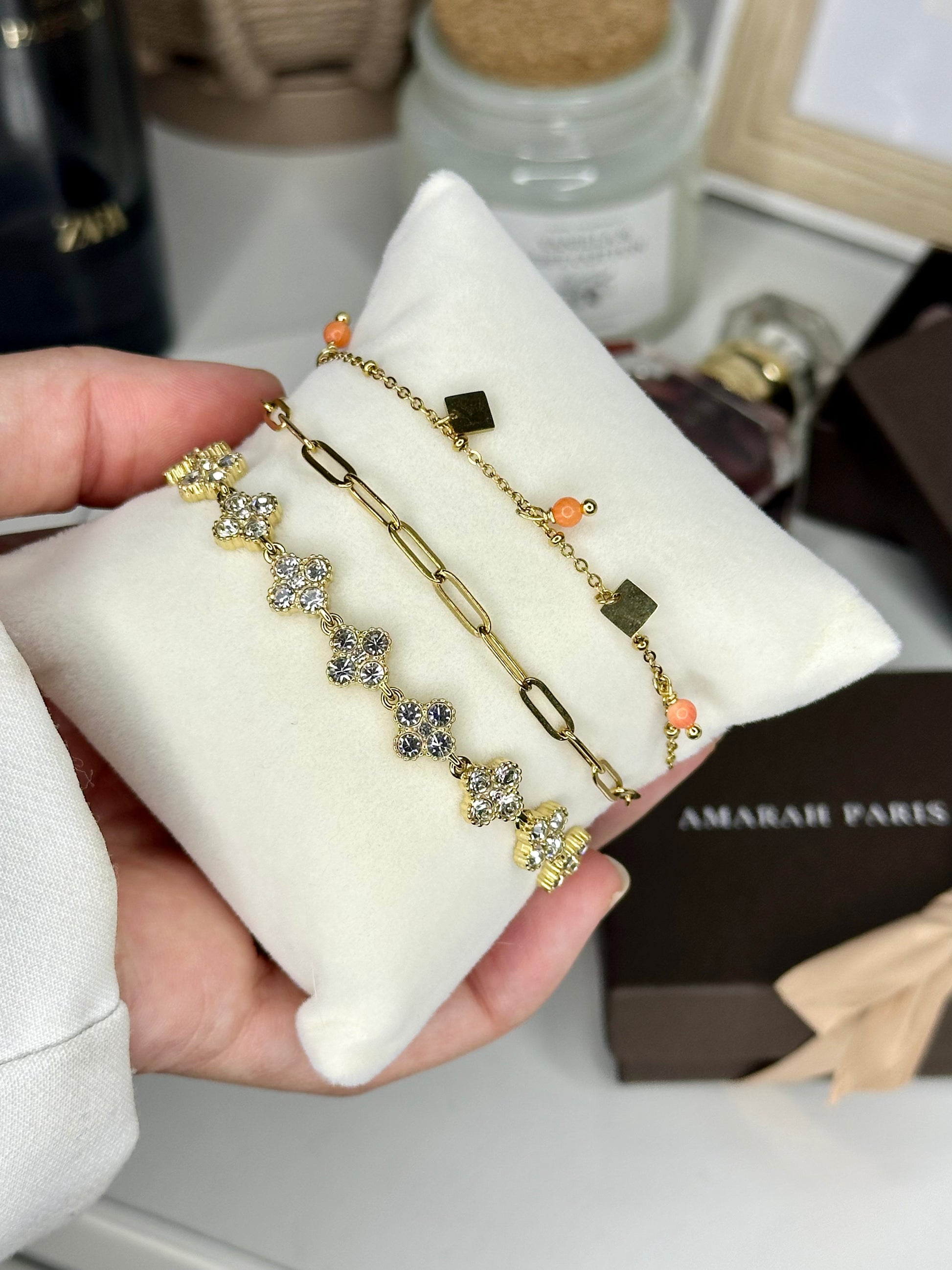 Un duo éclatant qui marie finesse et originalité. Le premier bracelet séduit par ses fleurs scintillantes serties de cristaux, le second mise sur un maillon doré moderne et minimaliste avec une touche de pampilles géométriques et ses perles colorées. Un set versatile qui s’adapte à toutes vos envies, de l’élégance chic au style plus décontracté.