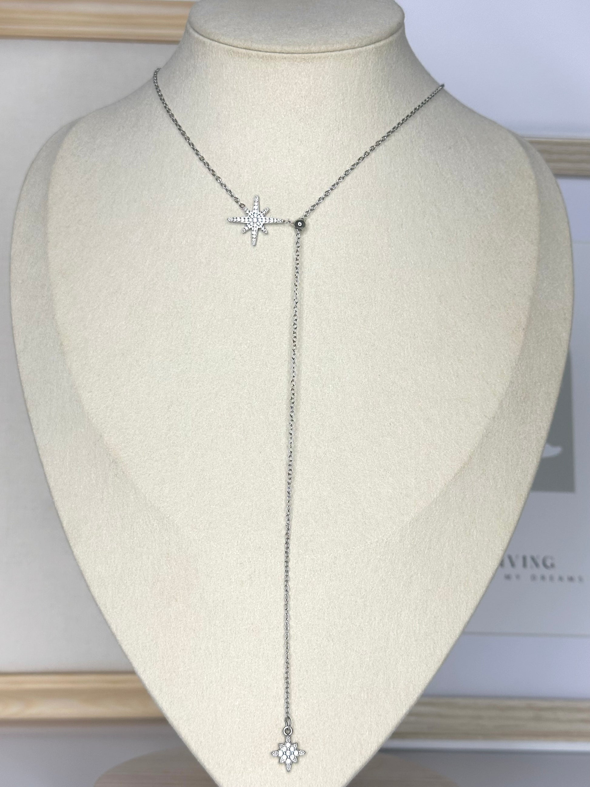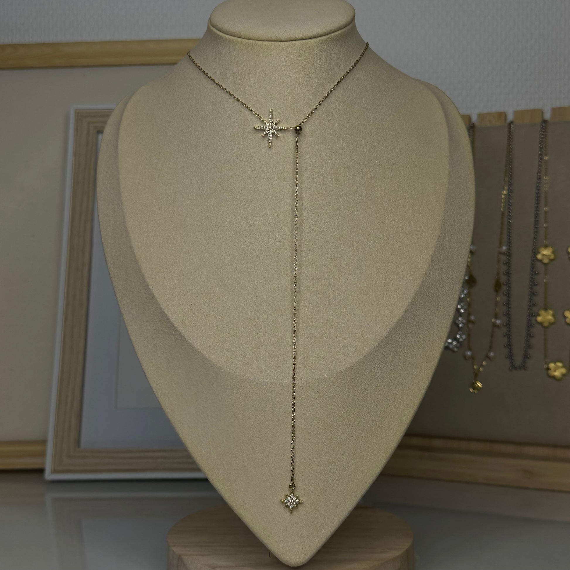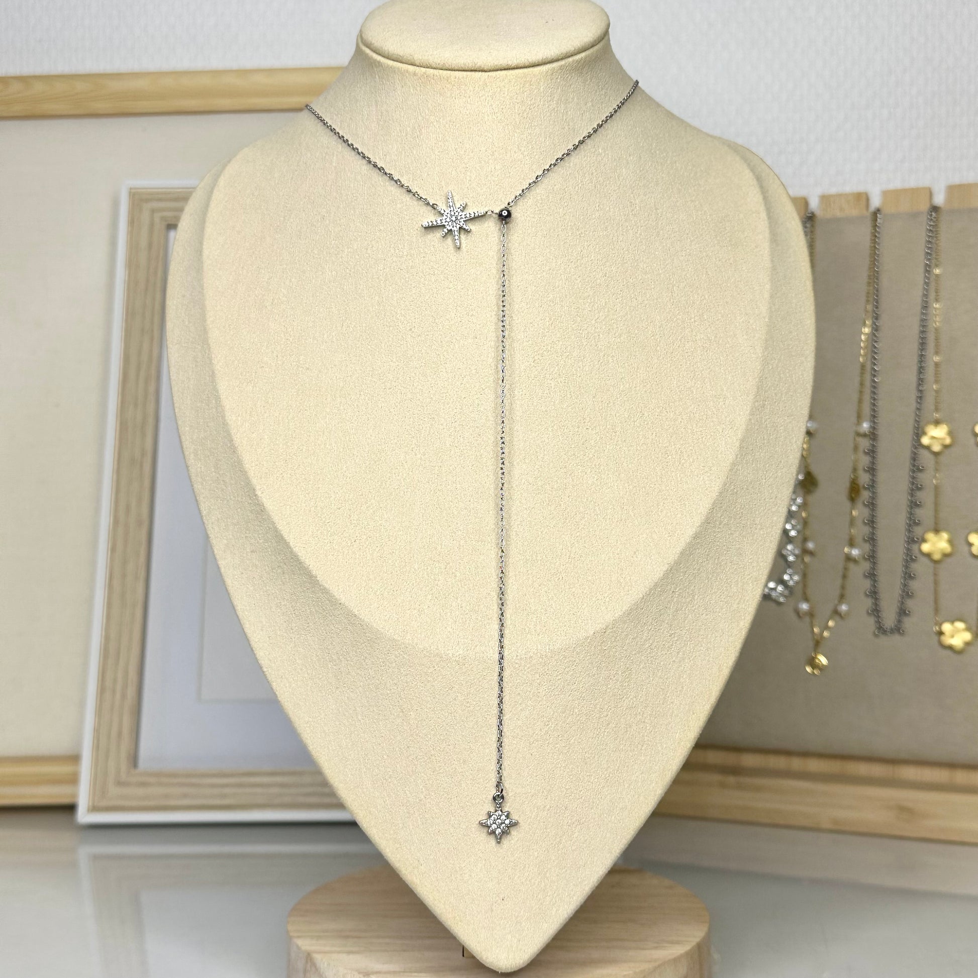 Un bijou raffiné qui capte la lumière à chaque mouvement. Son pendentif en forme d’étoile scintillante, prolongé d’une fine chaîne ornée de cristaux délicats, apporte une touche élégante et sophistiquée. Idéal pour sublimer une tenue de soirée comme un look quotidien chic.